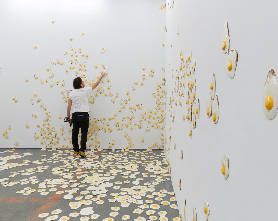 The Guiness Book of World Records was a huge influence on me as a child and as I began to work in earnest as an artist.Both my mother and my brother are psychotherapists so that language and the thinking as both a patient and a critic of other people's psychological inner lives is a huge influence. My first show had a smiling photograph of me in between my mom and dad. A classic family photo except that I had the words 'I want to fuck my mother and kill my father' written on my t-shirt. Iconic things from my childhood also serve as both a springboard and actual materials in my work - i.e. weber grills, hermit crabs, corn on the cob, Speed Stick deodorant, Volvo headrests, lay-z boy chairs, et cetera. I think that I knew that there was something conceptually and perhaps sculpturally powerful about those things when I was young and that's why I began to be fascinated by them then. As an adult artist I try to dig into them and find out why I am still fixated.Most importantly, life is a struggle for me and as far as I can tell for everyone I've ever known, this struggle is not minor, it hits me everyday in multiple ways and it's what led me to my post-college psychological space shuttle explosion. My difficultly making sense of things or having a "positive outlook" was and has been described as and diagnosed as depression. An affliction I share with my father. I cannot underestimate the power or the influence this struggle has had on my artwork - its my guiding dark.