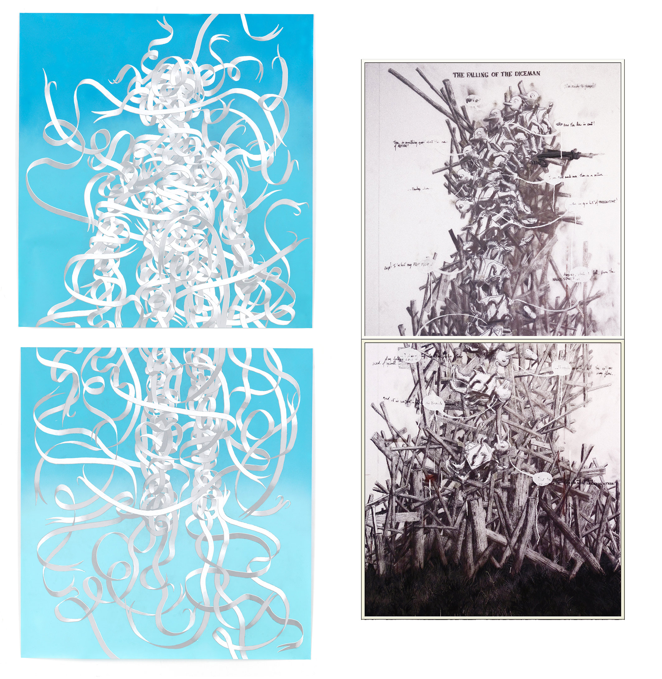 So please tell us about your upcoming projects? ||| I am working on a six episode strong graphic novel where the hero is the dice man. I am currently finishing an artwork close to still life, which belongs to the series “Habiter la Viande” (Live in the Meat) - basically three large pieces of meat hanging which will work as the matrix of a small village, like you can see on the Amalfi Coast, with stairs and small bridges. I also have a dictionary page in the works, a POSCA painting which shows “La Femme Presque Invisible” (The Almost Invisible Woman), a sand sketchbook, a series - “a very old thing” - which presents Ben Grimm at the hospice, new pawns, a new series of photographs titled “Planqué à L’atelier” (Stashed in the Workshop). I'm preparing a big scenography with an engineer, the black box, which allows me to show 96 black designs on chair rails moving. I'm also working with Gaël Charbau on what he calls an introspective. An exhibition where we will organize and show 25 years of work from pieces that have never been shown in public. Plus two or three other things... sorry, I do not make this list to show off and play the big guy! But as far as I can remember, I have always worked on multiple projects, and I like it when they all add up to a kind of weaving. At this very moment, I have the feeling of living life to the fullest. Thank you for your attention!