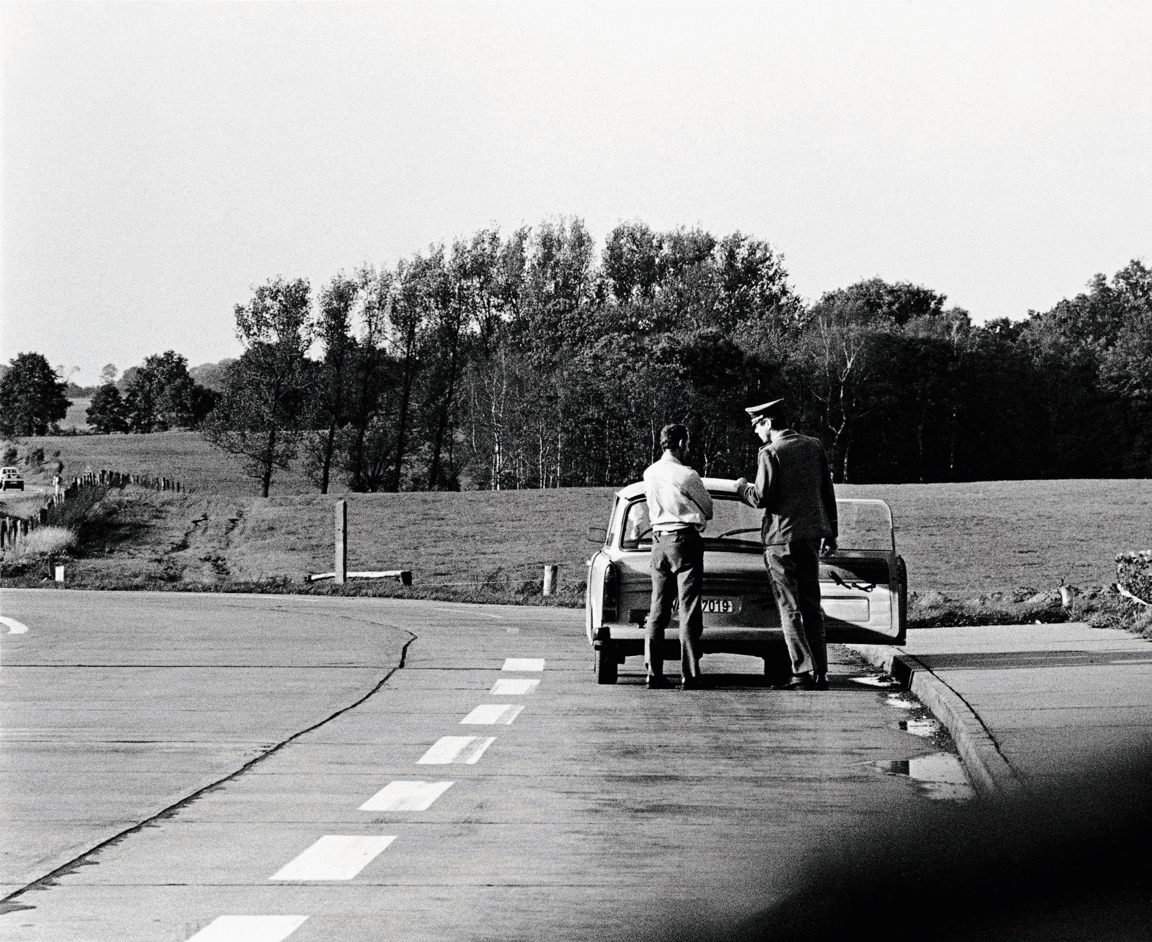 Das war ja wohl ein Gegenbild zum US-Roadtrip, eine Schnittstelle deutsch-deutschen Alltags zwischen den großen politischen Blöcken. Aber eben auch ein Teil des Berliner Alltagslebens, eigentlich was Doppeltes: vertraut und doch sehr fremd, unter strenger Reglementierung. Ja, da war die Idee mit einem mal da, wir machen Fotos vom Transit. Wir waren kurz entschlossen und fuhren mit dem weißen VW-Bus meines Bruders am ersten Tag nach Hamburg, übernachteten bei meinem Freund Hans Froese in Hamburg. Auf dem Rückweg machten wir wieder Fotos.