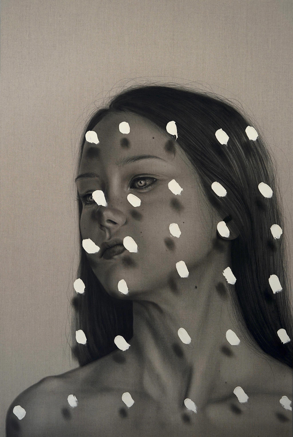 Currently living in rural Ontario, King has suffered from agoraphobia since many years already, a disease which makes it impossible for her to leave her own four walls without having severe panic attacks. And maybe that’s why her pre-dominantly monochromatic hyperrealistic paintings and images have this urgent, haunting and otherworldly quality to them. The work of the award-winning exceptional talent raises questions about identity and objectification as it challenges norms by shifting the status quo of the omnipresent conception of beauty. Lodown had the chance to hook up with Ms. King in mid-May..