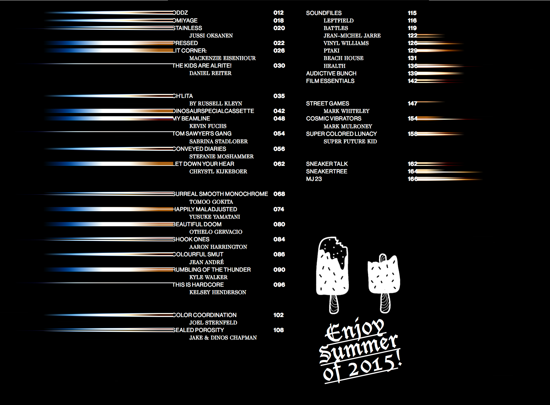 Features: Miyage, Stainless - Jussi Oksanen, Lit corner - Mackenzie Eisenhour, The kids are alright - Daniel Reiter, Ch'lita by Russel Kleyn, Dinosaurspecialcassette, My Beamline - Kevin Fuchs, Tom Sawyers Gang - Sabrina Stadlober, Conveyed Diaries - Stefanie Moshammer, Let down your heart - Chrystl Kijkeboer, Surreal smooth monochrome - Tomo Gokita, Happily malajusted - Yusuke Yamatani, Beautiful Doom - Othelo Gervacio, Shook ones - Aaron Harrington, Colorful smut - Jean André, Rumbling of the thunder - Kyle Walker, This is hardcore - Kelsey Henderson, Color coordination - Joey Sternfeld, Sealed Porosity - Jack & Dinos Chapman, Street games - Mark Whitelay, Cosmic vibrators - Mark Mulroney, Super colored lunacy - Super future kid