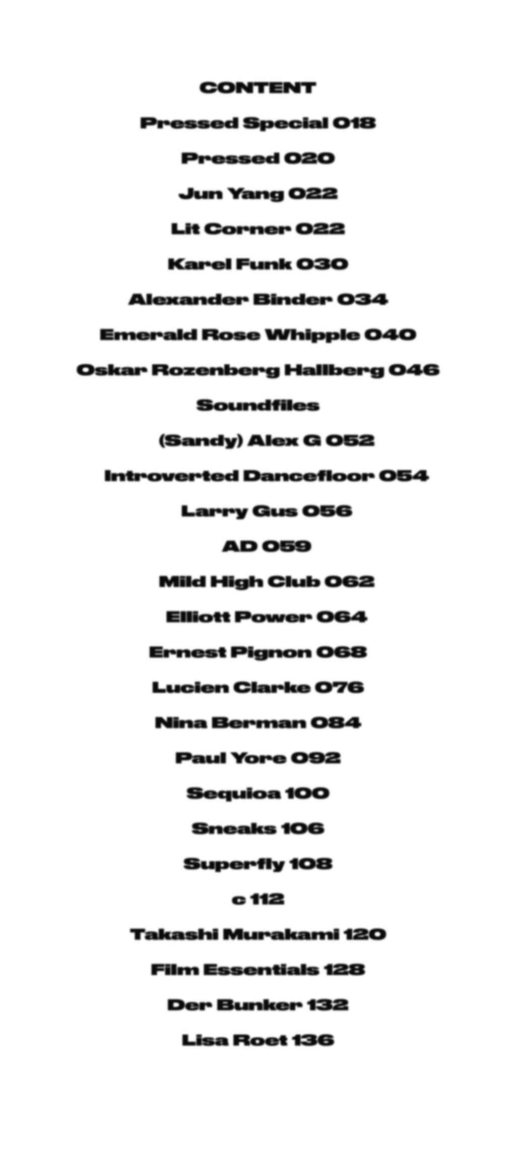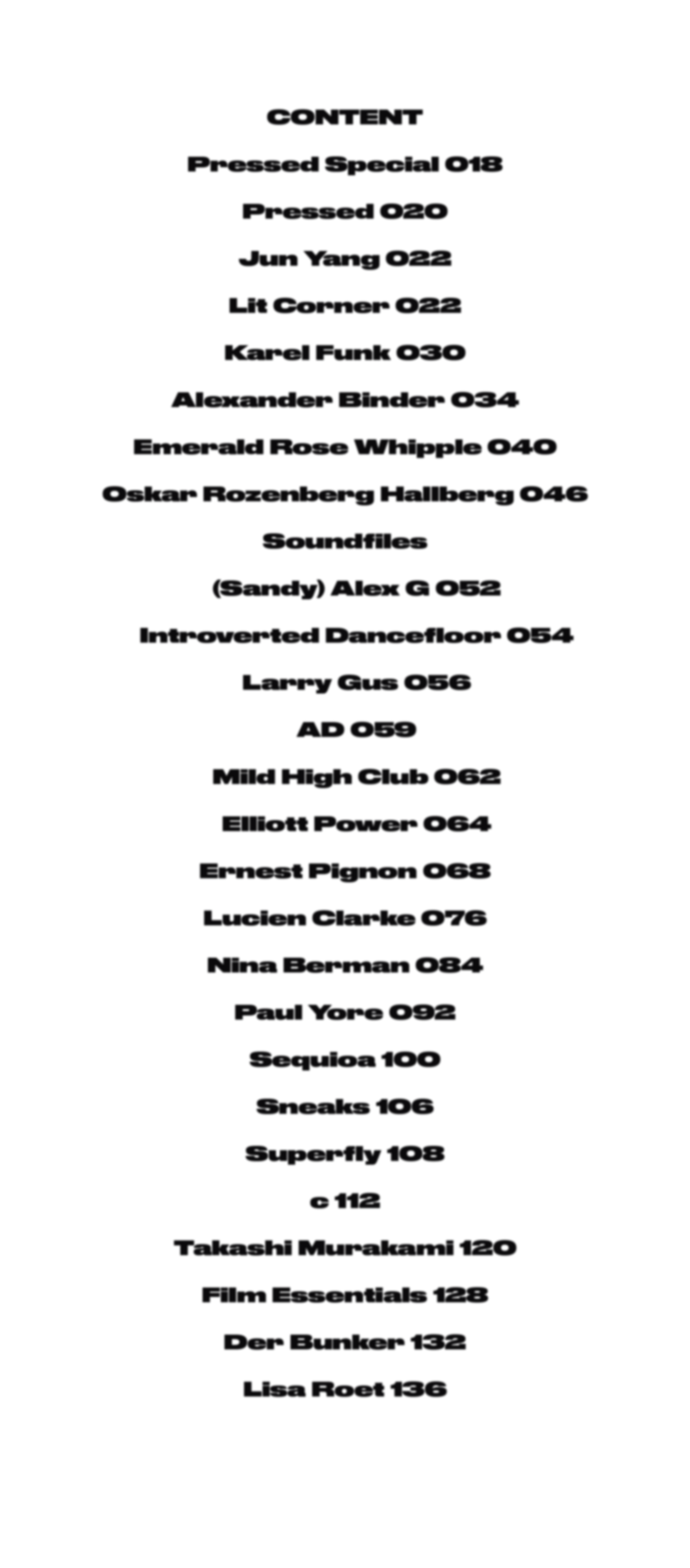 Features: Pressed Special FOG, Jun Yang Lit Corner, Karel Funk, Alexander Binder, Emerald Rose Whipple, Oskar Rozenberg Hallberg, Larry Gus, Ernest Pignon, Lucien Clarke, Nina Berman, Paul Yore, Sequioa, Superfly, Esther Stewart, Takashi Murakami, Film Essentials, Der Bunker, Lisa Roet
