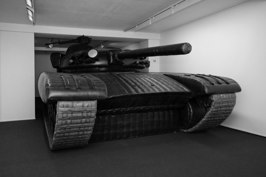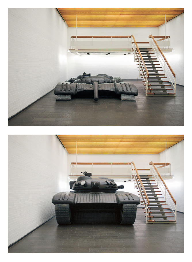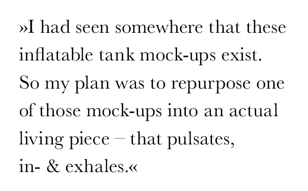 The tank was part of a 2007 Exhibition that was titled "Neue Heimat" & I had this incredible idea for a piece. I had seen somewhere that these inflatable tank mock-ups exist. So my plan was to repurpose one of those mock-ups into an actual living piece - that pulsates, in- & exhales. So I bought one of those tank mock-ups at a Chinese company & remodeled it so that air is blown in and sucked out in minute to minute intervals. Envision this tank that keeps inflating and then almost implodes an instant later & that on heavy repeat. There’s definitely a bit of slapstick behind it - like a cannon that straightens upward to take aim but then just falters to the ground.