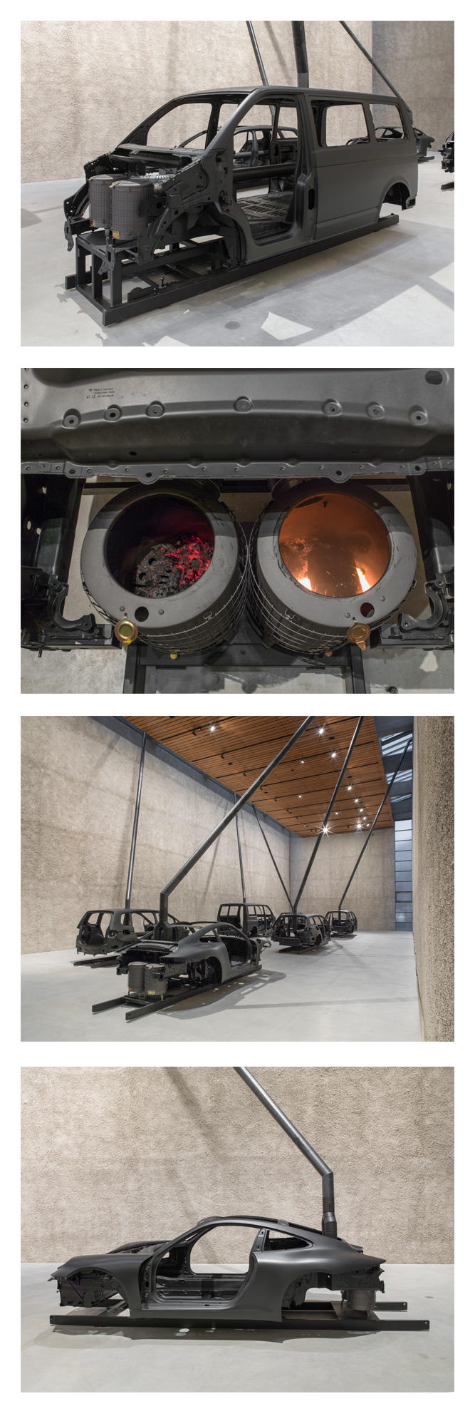 You’ll notice how the cars are lined up as if they were part of factory assembling lane. Further the exhausts are in use, thereby suggesting some genuine type of production activity resulting in the known negative impacts such as pollution and greenhouse gasses. The other constituent that was crucial to express is this impression of traffic. The idea of a complete standstill - about working time spent on the highway - the moment of standstill in movement. It’s about utilisation of resources and lastly about utter & complete congestion. There’s no way further. All that’s left standing are these auto bodies, a vivid impression of a post apocalyptic realm. Then there’s of course the aspect of heat development that gradually begins expanding throughout the space, gradually enveloping the entire space.