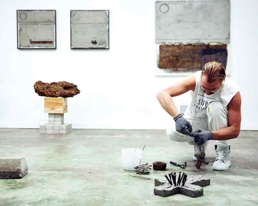It’s a progression which started out as an extension of graphic design, which I applied to canvas in a pop art vibe. The repetition and destruction of images lead to a texture base work. I was starting with shredding paper and applying it to canvases, and somehow putting cement on a wood panel. Originally I used it to mimic the wall for the artwork to be placed on, but I saw the beauty in the texture and deterioration of walls. Trying to replicate these structures lead to cement as a media, which is really fascinating as a skateboarder, graffiti writer, and artist. In our society cement is such a significant tool for our advancement and to create these cities, in which we all congregate together and exist. Cement has these unique properties, when you can’t really control it. The difference in the water mix, temperature, and humidity affect the way that it dries and the patterns that naturally occur within this medium. I’ve been heavily experimenting with cement and wood for framing, sometimes polyurethane resin and occasionally embedded steel. All these elements tie back to skateboarding in sort of an unintentional way which relates uniquely to me. Cement is by far my favorite medium as it has a life in all these different physical states and how you can work with it in these stages. Once it’s going, you have to meet the timelines to achieve your vision. I love the minimalism of cement and it represents a synthetic landscape to me. I enjoy creating these objects, because I feel that they retain energy, if I connect them in the right way it brings a good feeling to me.