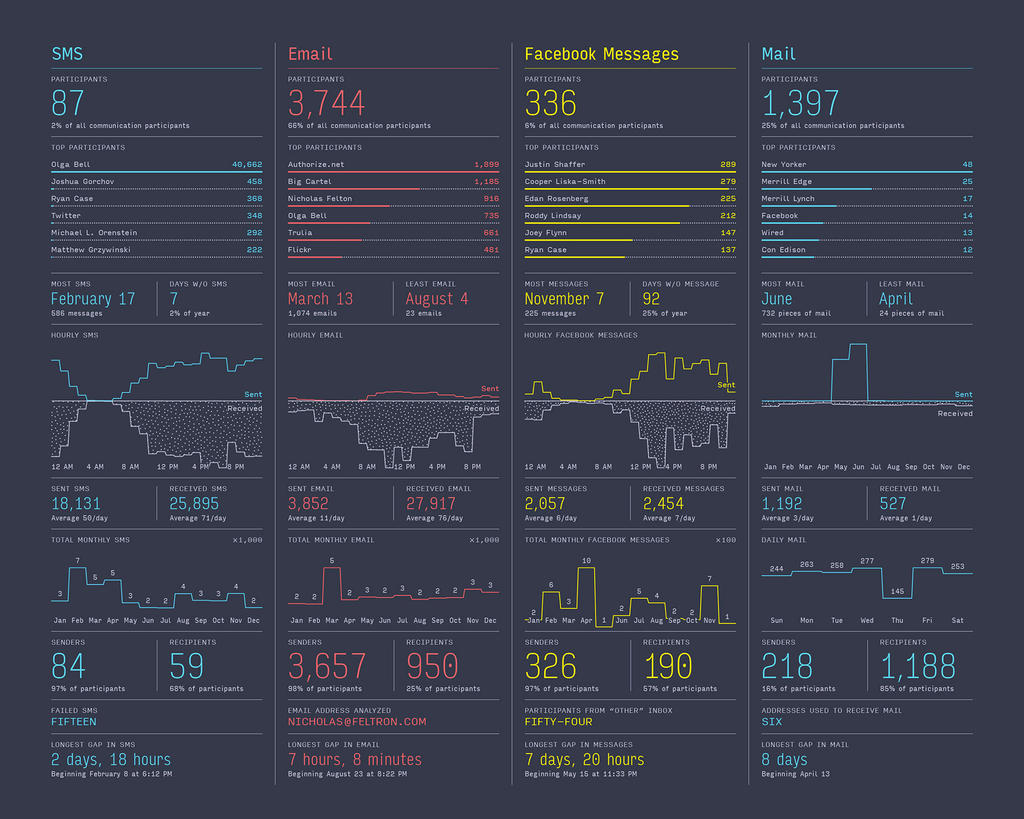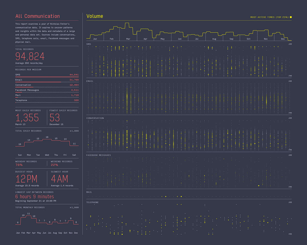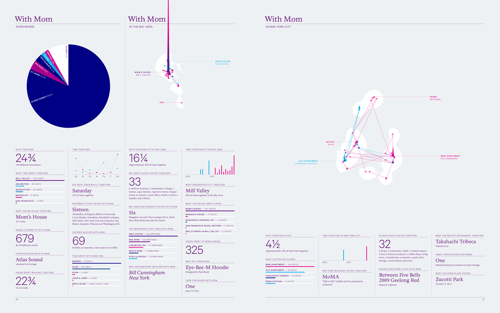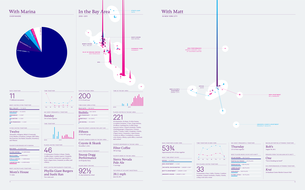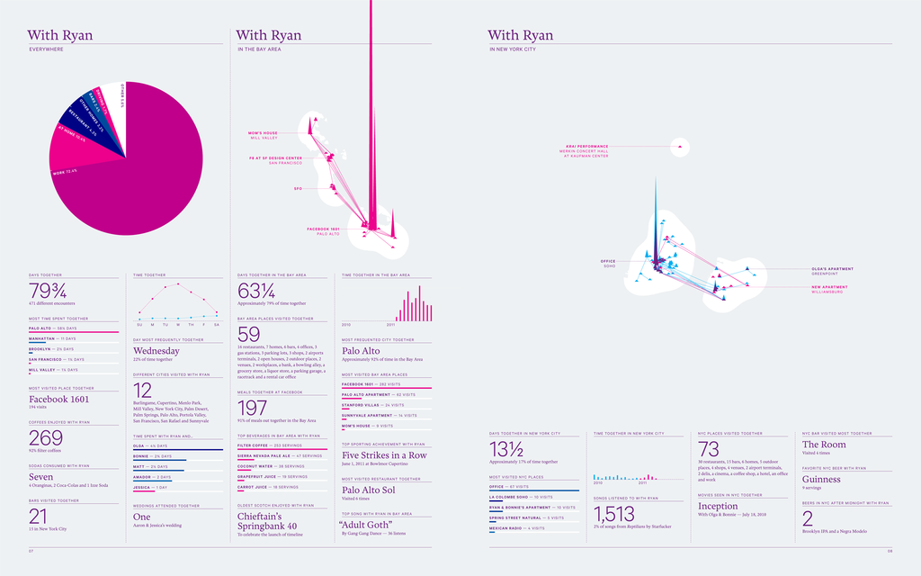 If data is the new oil, Nicholas Felton’s personal life has been one of the most lucrative wells for the last decade: One of the lead designers of Facebook’s timeline and the man responsible for Daytum.com, he’s not only pretty much obsessed with data, charts, and tracking what we do every day and how we do it – but he’s especially dedicated and committed to tracking his own life, his routines, and he’s been weaving the results into an amazing world of graphs, maps, and statistics for almost 10 years now. Having closely monitored his life for his stunning Annual Reports since 2005, he recently launched a new life-logging app called Reporter and is now in the final stages of collecting material for his 2014 Report – the ultimate one, wrapping up a decade in data collecting. Time to talk shop with the one true master of self-surveillance.