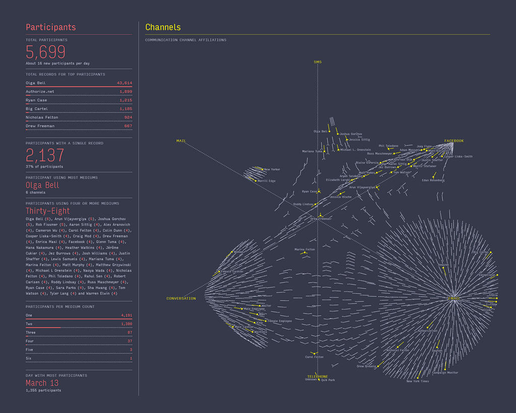 And this one: Since you captured a year of conversation before, does this mean this interview is going to be part of next year’s visual roundup? Unfortunately, I don’t think it will be a part of the next report. Communication was the theme for last year, and I’m not sure that any of my data-gathering schemes for 2014 will capture it.