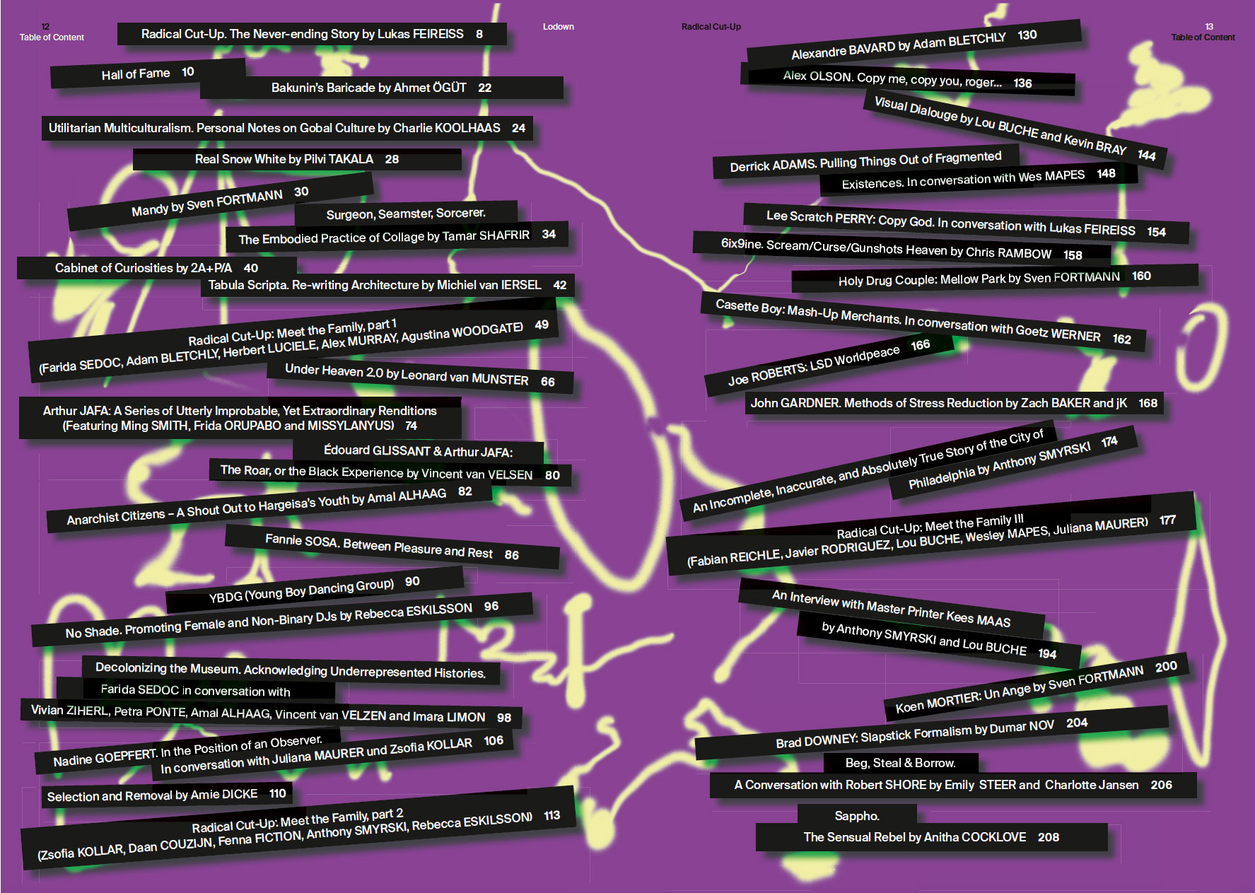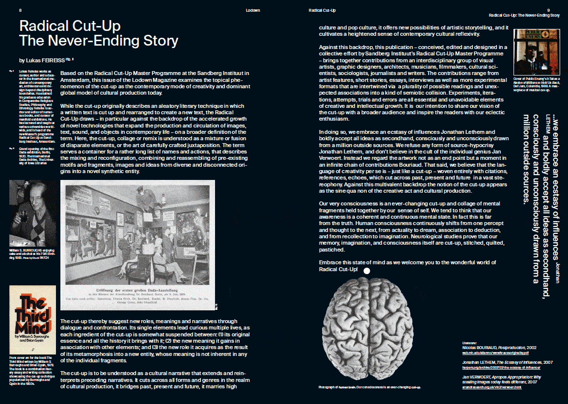 We teamed up with the students and tutors of the Radical Cut-Up program at Amsterdam’s Sandberg Instituut to create this text-heavy and très heady manifest of a phenomenon that needs to be discussed. It took a hell lot of time to execute this issue - and we are not even sure if our readers would like to dip in. But as you know, over here at Lodown are forces at work that tend to get bored very quickly and therefore love to take you to some fairly weird places you might not want to go in the first place - call it a delayed departure due to consciously getting lost on the road. This topic isn’t necessarily something the major corporations want to sink their teeth in either - they just love to follow a beaten and safe path - and we pretty much learned that the hard way. So what is left when everything looks the same worldwide, when each and everyone is following the tyranny of clicks and likes? Could Cut-Up culture safe us from singularity and open doors to some new shit? We honestly don’t know.. but here is something for the mix anyway. Enjoy. Buy print! - the last independent resort.