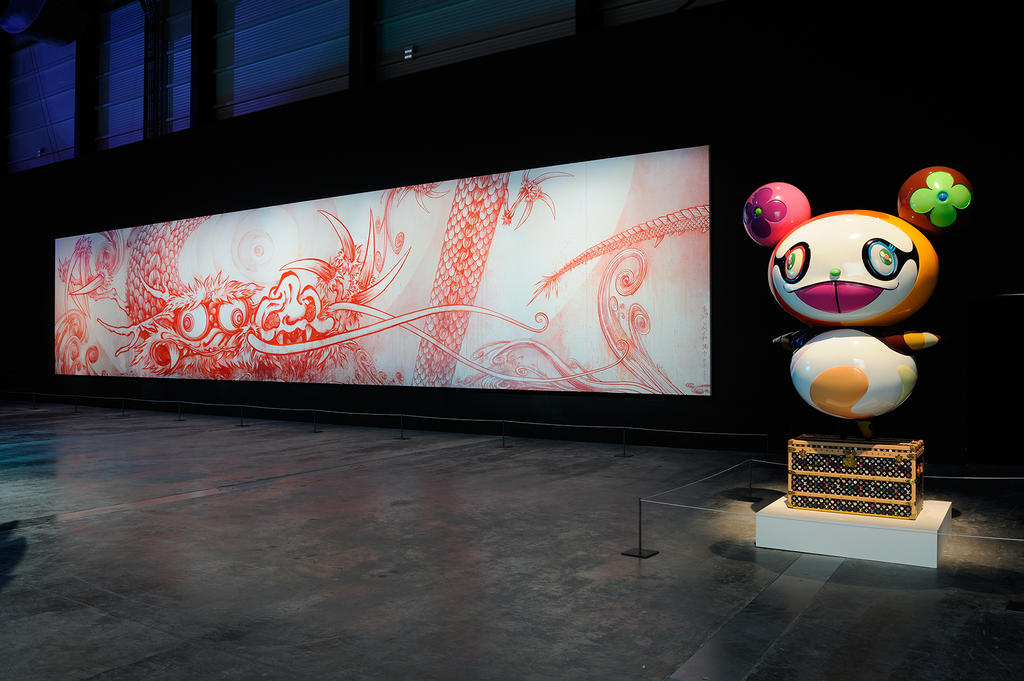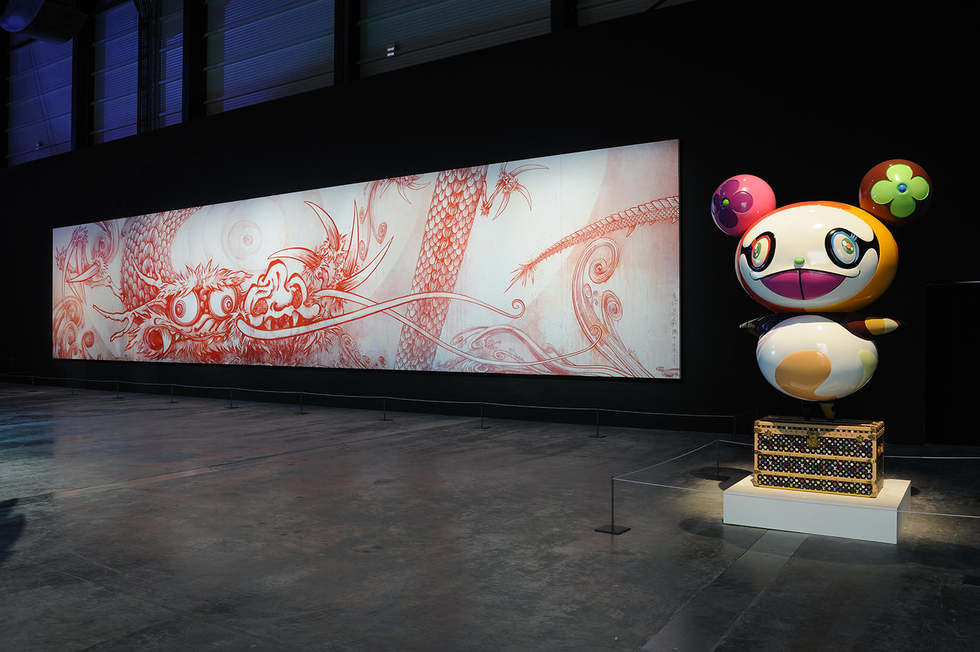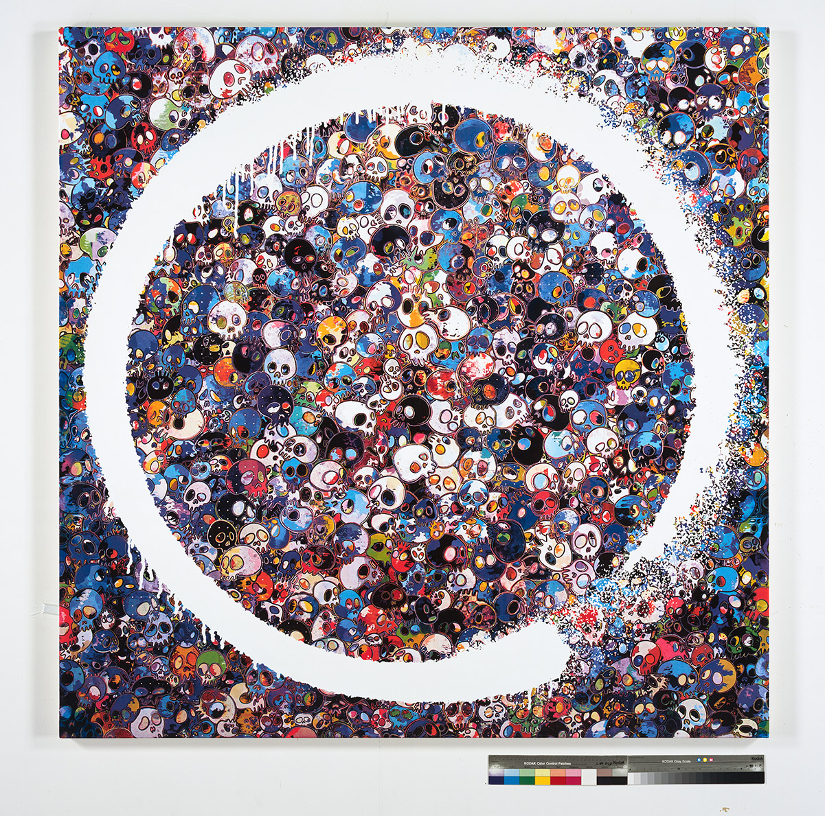 In 2000, Murakami published his “Superflat” theory in the catalogue for a group exhibition of the same name that he curated for the Museum of Contemporary Art, Los Angeles. The theory posits that there is a legacy of flat, 2-dimensional imagery which has existed throughout Japanese art history and continues today in manga and anime. This style differentiates itself from the Western approach in its emphasis on surface and use of flat planes of color. Superflat also served as a commentary on post-war Japanese society in which, Murakami argues, differences in social class and popular taste have ‘flattened,’ producing a culture with little distinction between ‘high’ and ‘low’. The theory provided the contextual background for his work and he further elaborated on it with the subsequent exhibitions, “Coloriage” (2002, Fondation Cartier pour l’art contemporain, Paris) and “Little Boy: The Arts of Japan’s Exploding Subculture” (2005, Japan Society, New York). These exhibitions helped introduce Japan’s lesser-known creative culture overseas and such curatorial projects would become an integral part of Murakami’s multifaceted artistic practice. In accordance with the Superflat concept, Murakami’s practice involves repackaging elements that are usually considered “low” or subcultural and presenting them in the “high-art” market. He then further flattens the playing field by repackaging his “high-art” works as merchandise, such as plush toys and T-shirts, making them available at more affordable prices.