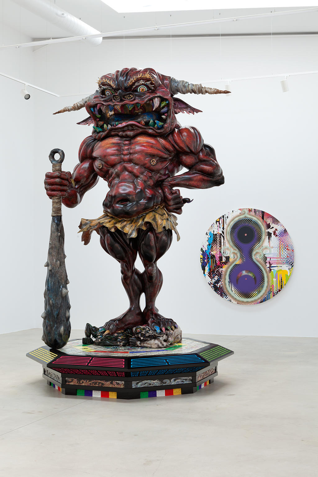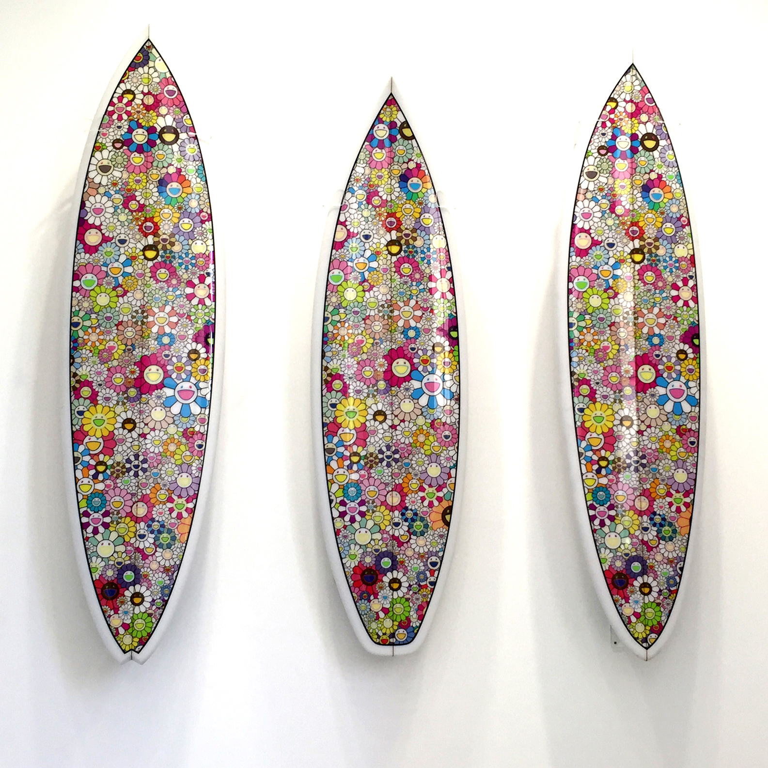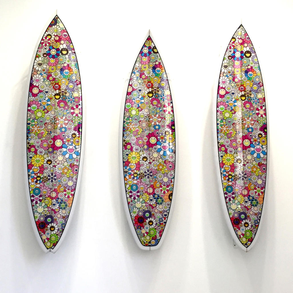 In 2000, Murakami published his “Superflat” theory in the catalogue for a group exhibition of the same name that he curated for the Museum of Contemporary Art, Los Angeles. The theory posits that there is a legacy of flat, 2-dimensional imagery which has existed throughout Japanese art history and continues today in manga and anime. This style differentiates itself from the Western approach in its emphasis on surface and use of flat planes of color. Superflat also served as a commentary on post-war Japanese society in which, Murakami argues, differences in social class and popular taste have ‘flattened,’ producing a culture with little distinction between ‘high’ and ‘low’. The theory provided the contextual background for his work and he further elaborated on it with the subsequent exhibitions, “Coloriage” (2002, Fondation Cartier pour l’art contemporain, Paris) and “Little Boy: The Arts of Japan’s Exploding Subculture” (2005, Japan Society, New York). These exhibitions helped introduce Japan’s lesser-known creative culture overseas and such curatorial projects would become an integral part of Murakami’s multifaceted artistic practice. In accordance with the Superflat concept, Murakami’s practice involves repackaging elements that are usually considered “low” or subcultural and presenting them in the “high-art” market. He then further flattens the playing field by repackaging his “high-art” works as merchandise, such as plush toys and T-shirts, making them available at more affordable prices.