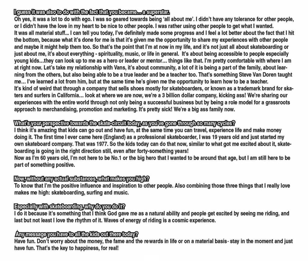Tony Alva, the man, the myth, the legendary Dog Town member, recently turned 60 years old - last September, to be precise - and VANS threw a party for him at the House of Vans in London. Obviously we also sent our best regards and caught up with him for a chat about the highs and lows in life - picking up the theme of our forthcoming print issue “Hightimes“.