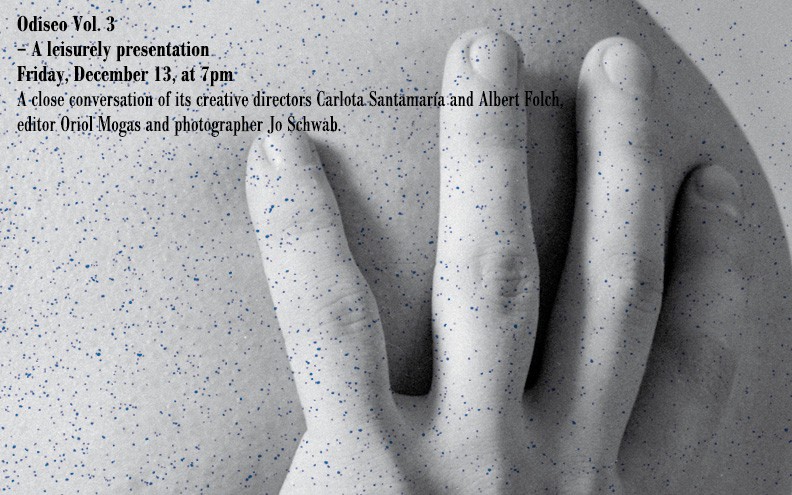 The third volume of Odiseo will be presented at do you read me?! Reading Room in a close conversation with its creative directors Carlota SantamarĂa and Albert Folch, editor Oriol Mogas and photographer Jo Schwab. Together, they will talk about the approach and the creative challenges they face in developing a publication that gathers intellectual essays and erotic photography.