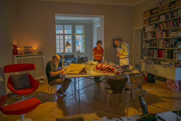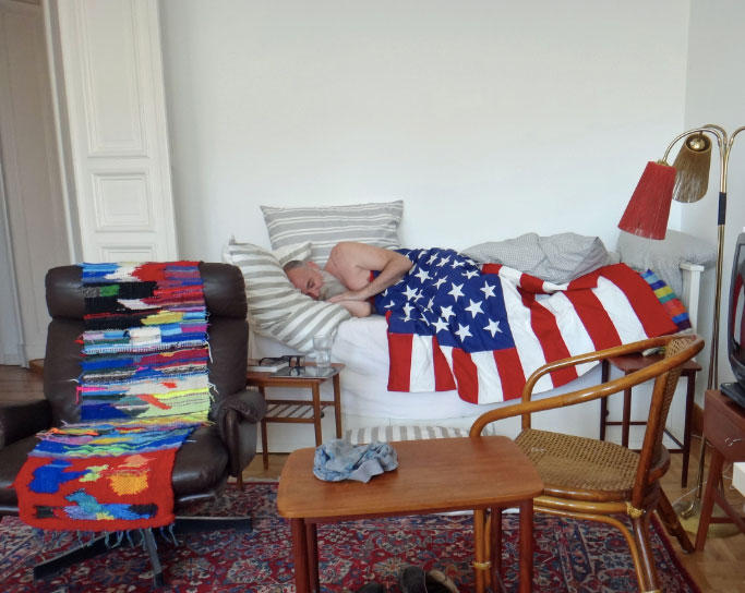 This show presents seven paintings, each constructed of an American flag, purchased on eBay, mounted on raw linen, and coated in layers of an antique preparation of rabbit skin glue, chalk, and honey. This compound was, historically, used to prepare the ground upon which a painting was painted; it is literally the foundation of a history of painting. But here the ground becomes the painting itself, shrouding each flag—each with its history implicit in torn edges, holes and rips—in an elegiac ashen presence.