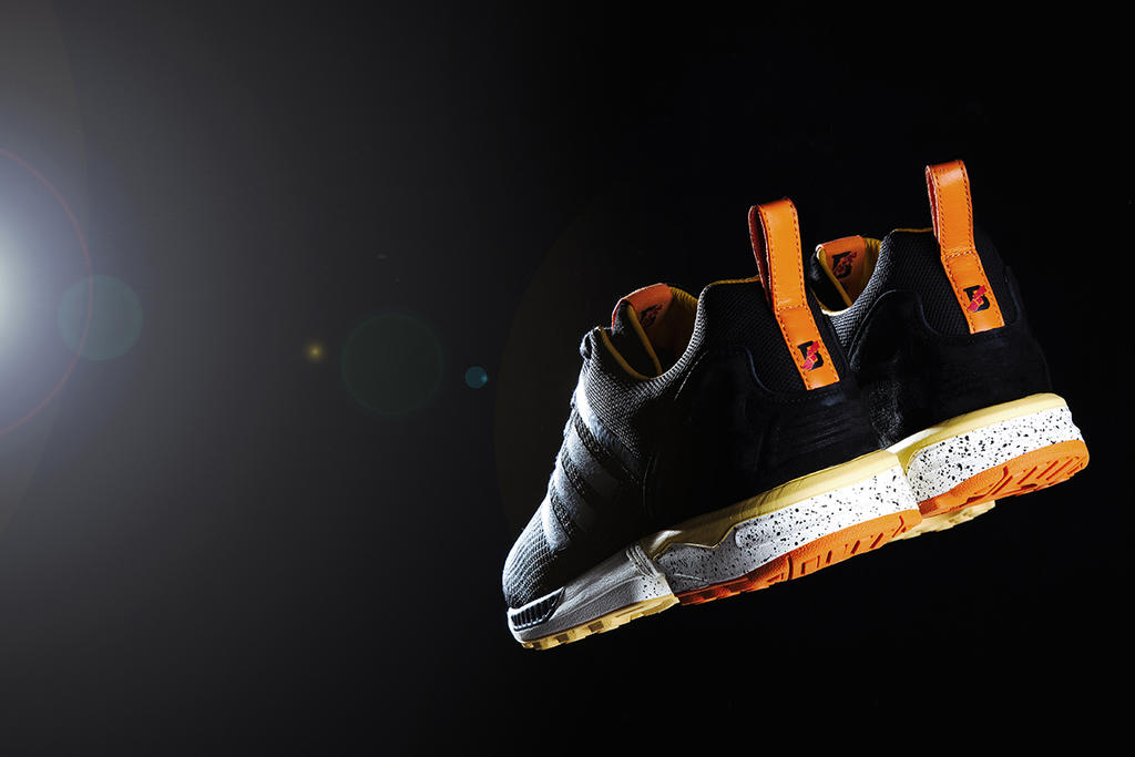 The ZX Flux BDGA's upper is made of black woven nylon combined with suede leather at some points. While the heel part of the sole is sprinkled and kinda looks like straciatella, the bottom comes in a soft yellow and some carrot-like orange which gets picked up on the inside and the tongue.