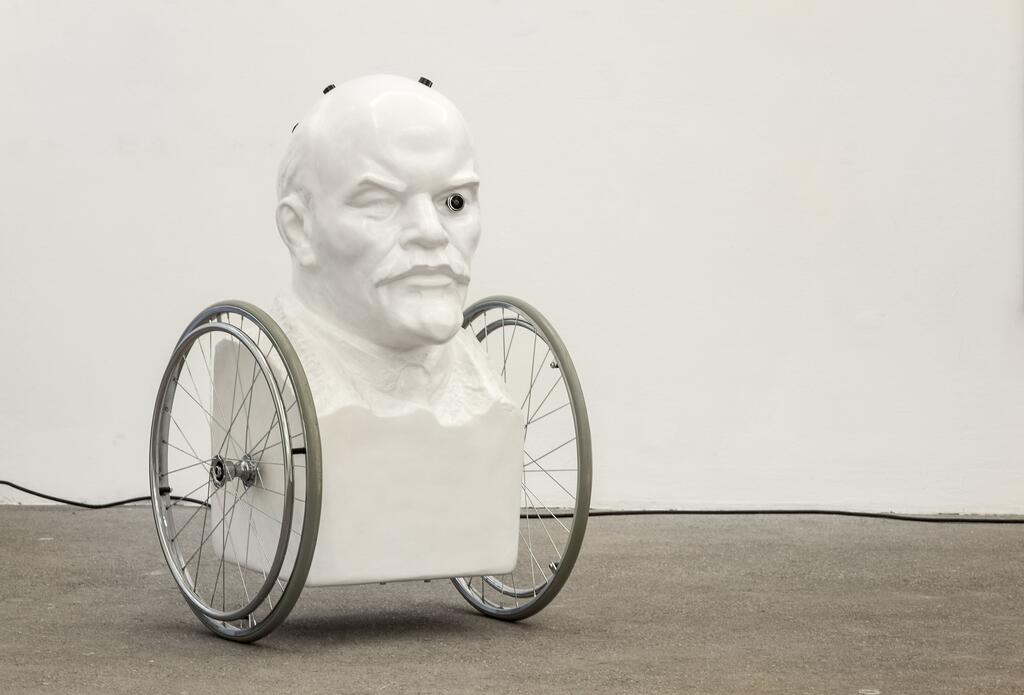 ORACLE is at first sight an amputated Lenin sculpture. Without arms, without legs, and without a voice. A head on a part of torso in a wheelchair. ORACLE is connected to the Internet and can perceive light and sound. While the Daimonion of Socrates warned him or kept silent, ORACLE only nods in agreement or remains silent. When nodding, the head swings back and forth on the axis of the wheels. If the Daimonion of Socrates was silent, Socrates interpreted this in reverse as agreement. Since Lenin can only agree, his silence will have to be understood as a warning.