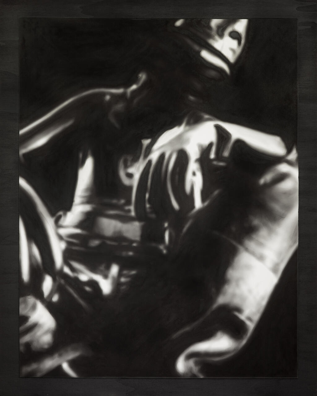 COSMOSE is a charcoal drawing from the series "Kohle für die Kunst". The drawings require a technically controlled biological process. Feuerstein obtains the charcoal for his drawings from algae, which he grows and carbonizes in the sculptures he constructs. COSMOSE oscillates between nature and technology, and the structure of the drawing probably looks not unlike the figurative idea of an ALGORITHMIC WEED. The technoid bale has something of an asteroid, consisting of a conduction system in connection with something organic, reminiscent of intestines or brain coils. The structure could also symbolically be the giant black box in which we all live and within which we are trapped. This black box is possibly similarly perceived from a long distance or from the cosmos. From the view of aliens with another means of perception, which will penetrate in an uncertain future into our cosmic black box and its algorithmic undergrowth. Because osmosis is the penetration of cell walls in only one direction. So aliens can penetrate our black box, but we cannot get out of it. We are caught in the net.
