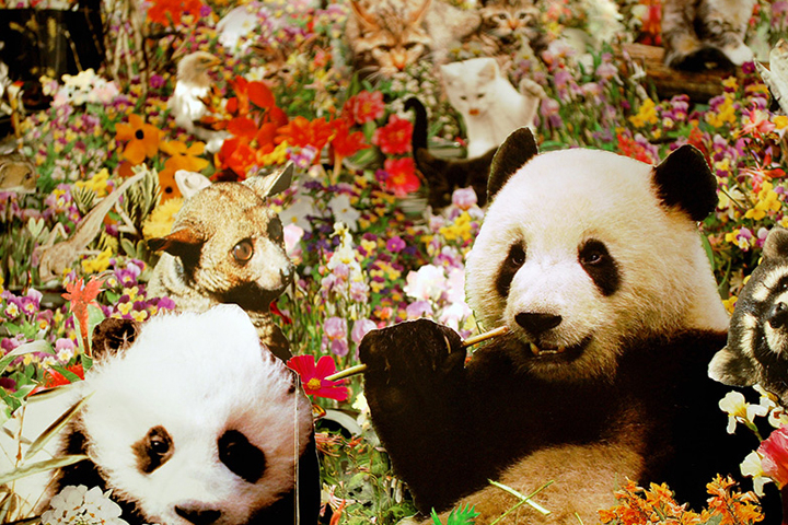 Obviously a funny nod to H.G. Wells' famous novel, the installation consists of hundreds and hundreds of cutout animals and plants from old textbooks, which the artist meticulously arranges for a very different kind of diorama.