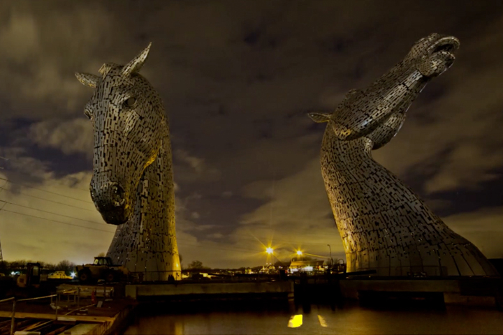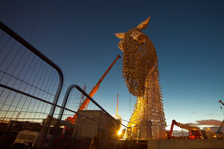 “The Kelpies is a timelapse short film by award winning filmmaker Walid Salhab. Using a unique hyperlapse technique, this video features footage captured within a live construction site. Created from over 60 days of stop-motion filming across seven months, and tracking construction through to completion, this film uses over 12,000 individual photos.“