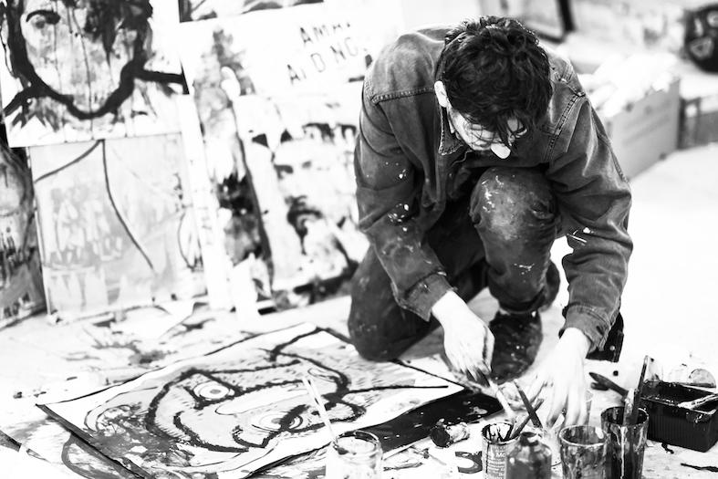 Materials such as acrylics, oil, ink, charcoal, pastel, coffee, Edding, found pots, lipstick, vodka and glue are smeared and exploded as infinite revolts are staged against order and the frozen moment of beauty. Provocation of mistakes and accidents is employed to liberate an instinctual response and dismantle any traditional notion of ‘finished work’. This elaborate process of attack unveils a compulsion to resist patterns and the contrivance of a particular style. A self-confessed art whore, each work is a turned trick of discarded notes, torn posters, messages on walls, blow-ups, pin-ups, photo copies, transfers and street detritus. Traces of intimacy, records of desperate emergency and messages of authority are recycled into the pulp of universal human experience.