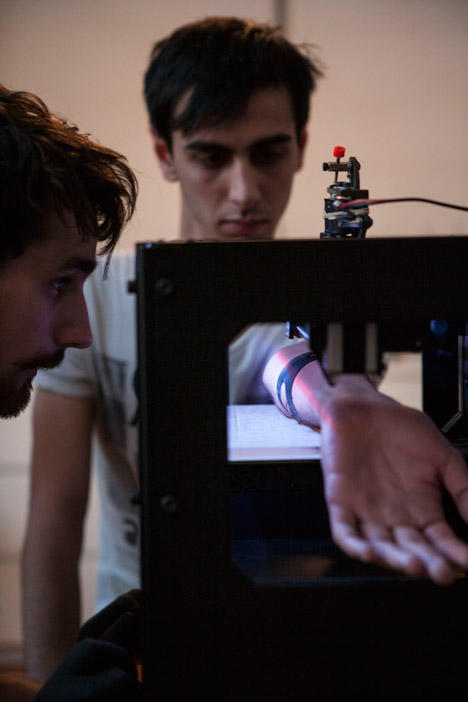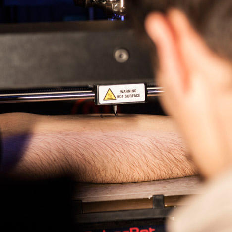 The user can insert a body limb into the printer - for now designed for the arm - and the needle draws the design into their skin. Right now the designers’ goal is to make the machine more accessible for any part of the body, which then implies a specific architecture.