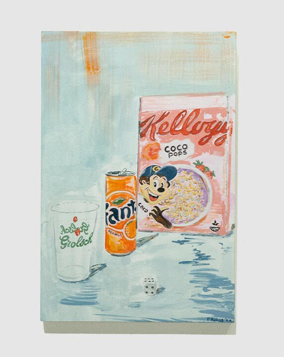 BF: I am fascinated by the meaning behind everyday objects. The ideas for my paintings come from my immediate environment. They can be thoughts about what has been carelessly left on the street. Ordinary objects such as a Fanta can or a pack of Kellogg's cereal turn out to carry intriguing (and sometimes disturbing) associations and histories. For example, Fanta was developed in Nazi Germany as an alternative to Coca-Cola, which was no longer available.