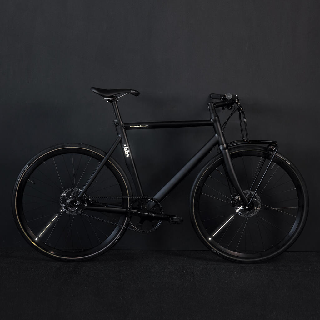 Schindelhauer and HHV. A limited special edition of the »Jacob« bike was the outcome, a sleek singlespeed bike, perfect for city nights.Sporting an all-black colorway, the bike keeps things low key ninja at daytime, while only at night its details come to light.