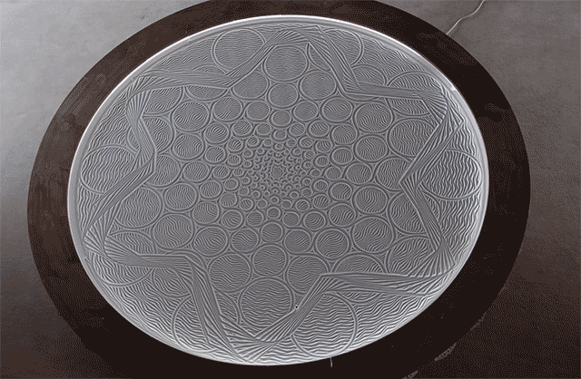 Everybody knows about the Japanese Zen sand garden, in which you draw a shape of your choice with a small rake. Well, there is no need anymore for tools and imagination with Bruce Shapiro’s invention: the Sisyphus Machine. It’s an elaborate kinetic drawing machine that uses magnets to drag rolling steel marbles through a thin layer of sand to create complicated patterns.