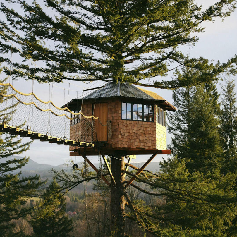 The structure is perched above the bowl, much like a crows nest in an old ship, this then leads down a narrow walkway towards the main tree house which appears to have space for basic sleeping quarters, a small workspace, which leads down to the skate bowl below and a wood fired soaking tub.