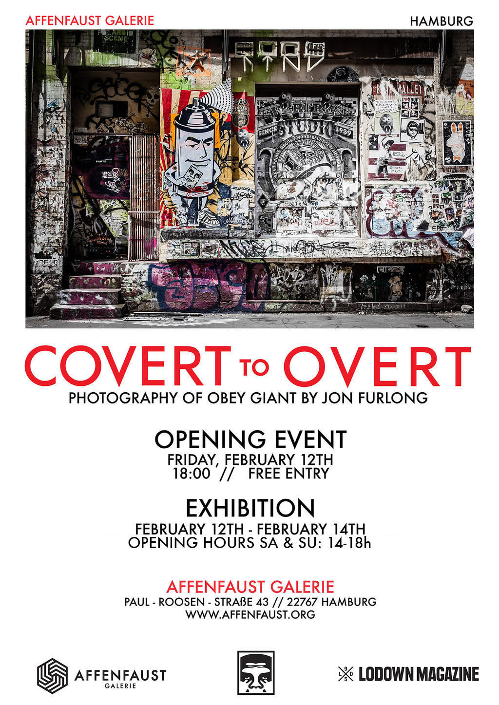 Affenfaust Galerie presents “Covert to Overt”, an exhibition documenting the endeavors of Shepard Fairey and his team captured through the lenses of photographer Jon Furlong. The selection of Furlong’s photos provide an intimate, behind-the-scenes window into the world of OBEY GIANT as he has been working and traveling with Fairey for over a decade