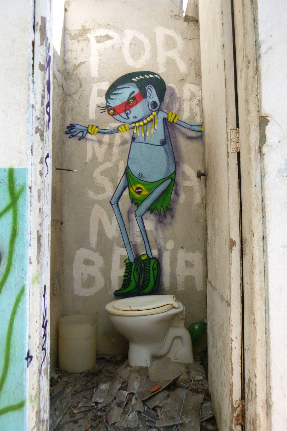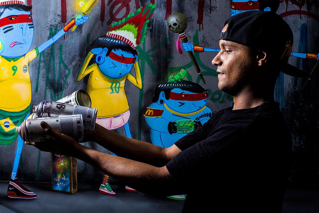 Sao Paulo born and raised artist Fabio Oliveira aka Cranio “skull” started covering the grey walls of his hometown in 1998. His work is marked by a great sense of humour and is inspired by little details that surround him in his daily life such as traffic jam, police abuse, worldcup, security, poverty and graffiti lettering – Cartoons and Salvador Dali are some of his greatest references.