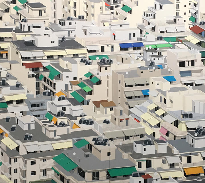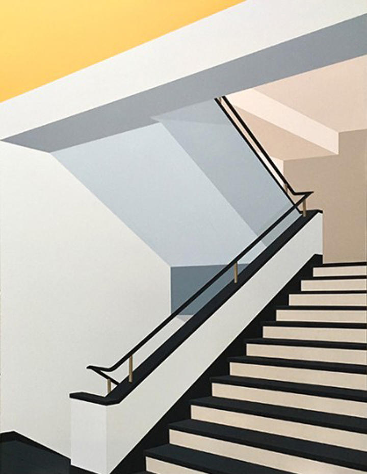 “The paintings in “Never Forever“ offer points of entry to consider architectures’ ability to serve as a symbolic backdrop for unfolding political events and changing power structures. The paintings, most often of the built environment, are always devoid of people—the human figure is implied through the presence and perspective of the viewer. Rich appropriates imagery found in newspapers and online in response to investigative journalism, literature and the news of the day. These source images get digitally altered and meticulously transcribed onto the surface of the painting panels. Each shape of the image then gets stenciled and painted individually with acrylic, creating densely rich, saturated surfaces constructed one shape and color at a time.“