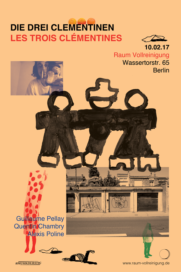 Friday 10th of February at 19.00h we recommend another Vollreinigung event to you: The grand opening of 'Die Drei Clementinen' a collaboration of artist Guillaume Pellay, Quentin Chambry and Alexis Poline.