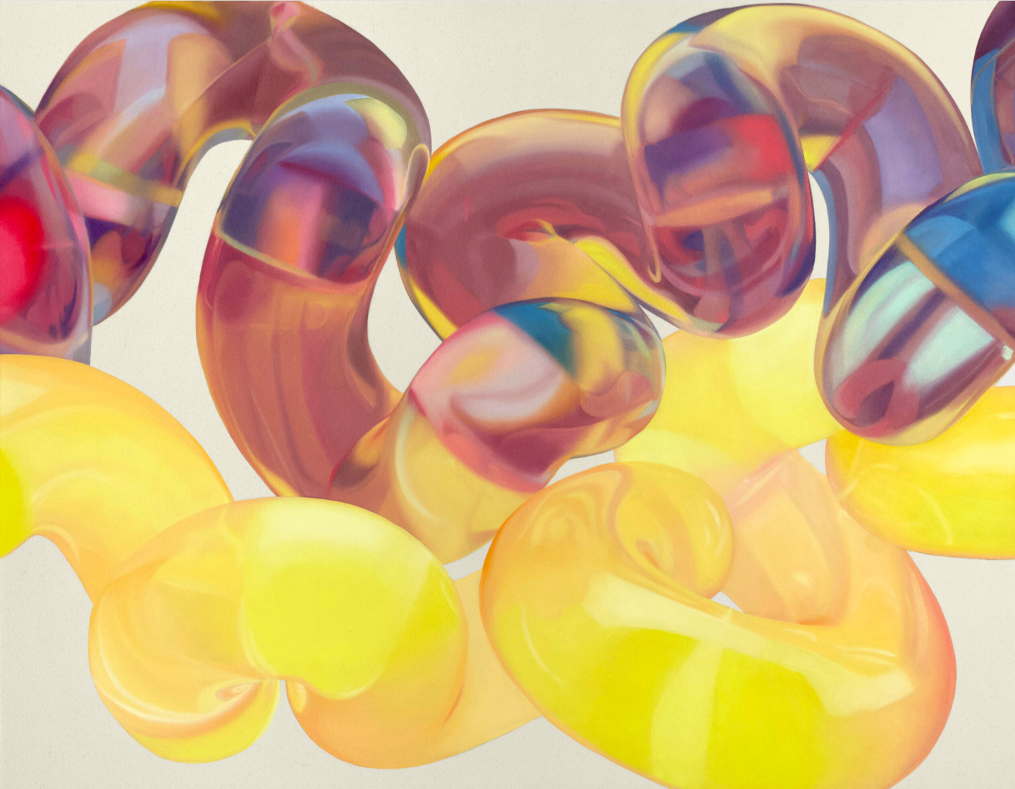 Vickie Vainionpää’s practice considers the impact of technology on the process of painting and investigates the relationship between natural forces and digital processes. In her ongoing Soft Body Dynamics series, twisting, tubular forms are systematically created using generative 3D modeling software. The software randomly generates a set number of splines per day, from which the artist selects to create final compositions which are painted by hand using oil on linen. These shapes curve, fold, and morph in ways reminiscent of limbs, intestines, or cellular organisms. In many ways they hold life in themselves, coming from a different kind of nature — a parallel wilderness — regulated by the forces of chance and uncertainty inherent to their digital environment. By embracing new digital means of reading space and content, the works draw attention to the ever-changing relationship between the human body and digital technology.