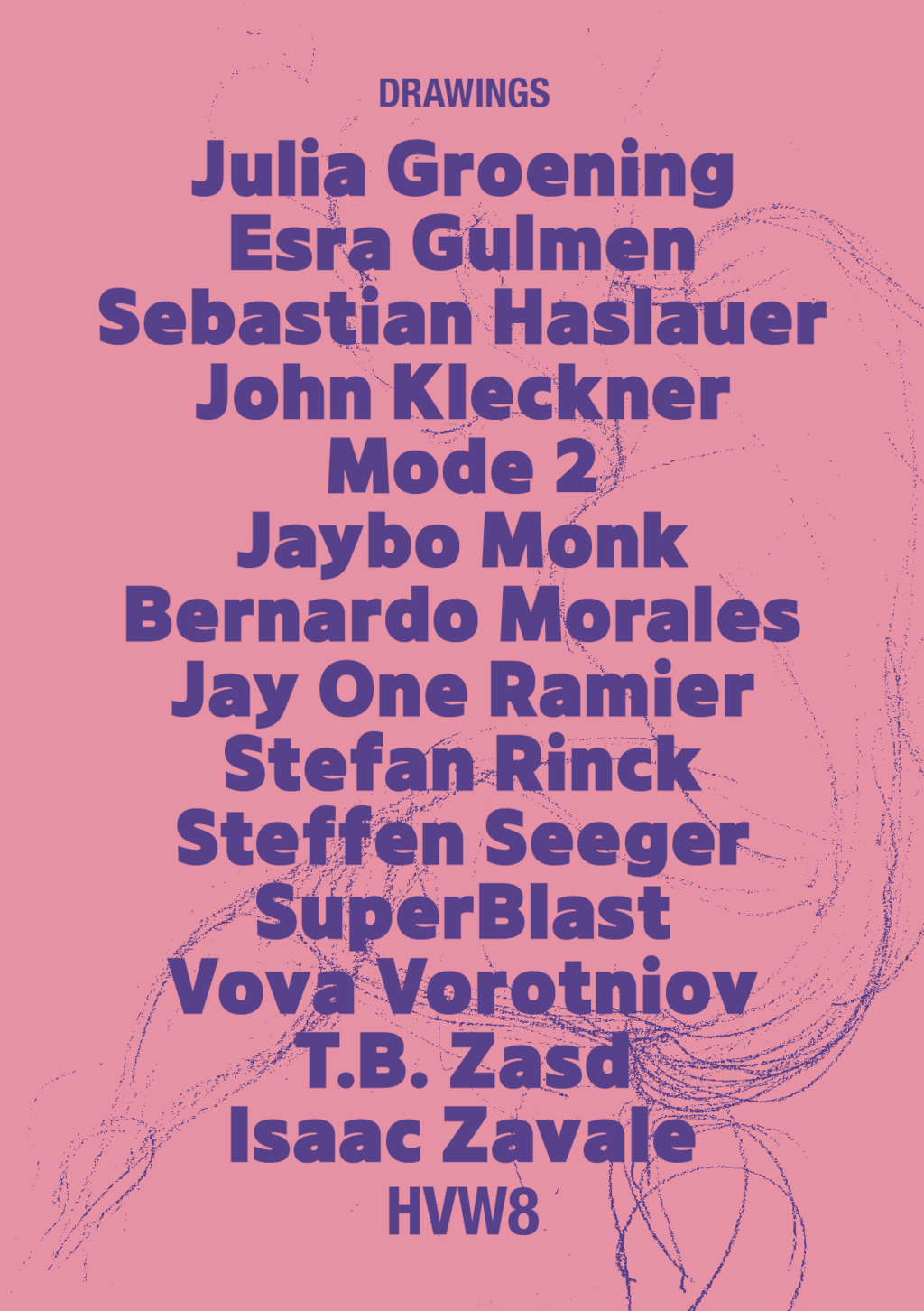 HVW8 Gallery Berlin presents DRAWINGS, a new group exhibition featuring the works of Julia Gröning, Esra Gülmen, Sebastian Haslauer, John Kleckner, Mode 2, Jaybo Monk, Bernardo Maldonado Morales, Jay One Ramier, Stefan Rinck, Steffen Seeger, SuperBlast, Vova Vorotniov, T.B. Zasd and Isaac Zavale.
