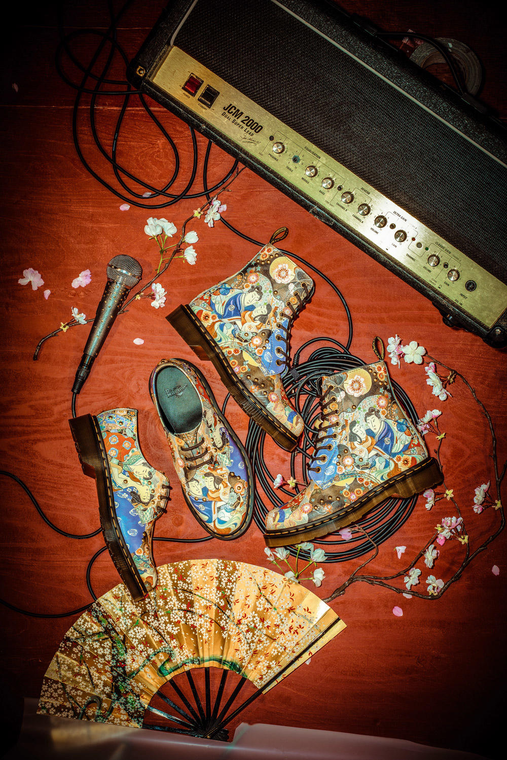 Inspired by original Japanese paintings, Dr. Martens created custom designs in-house, that are beautiful and super detailed. The Eastern Art collection consists of the 1460 boot, 1461 shoe and accessories. While paying homage to the traditional art of Japan in a fresh and contemporary way, the designs are digitally printed onto Backhand Straw Grain leather which is embossed to emulate the traditional parchment these scenes would have been painted on. To keep it classy gold hardware and studs complete this ornate offering.