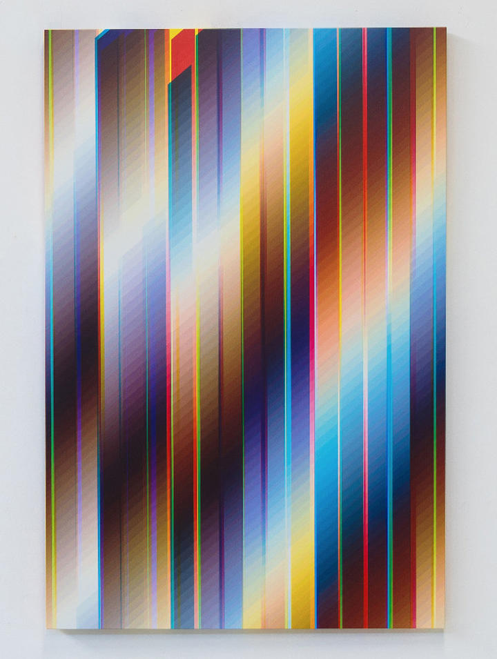 As a self-described "child of the internet era", Argentina-born artist Felipe Pantone's first solo exhibition “Transformable Systems“ at Joshua Liner Gallery is filled with abstract works reminiscent of the digital age. The dynamic images, separated into three distinct bodies of work and created using computer-generated graphs, UV-printing and other digital and non-digital means of manipulation combine bright colors with the recognizable shapes of QR-codes, grids and enlarged pixels.