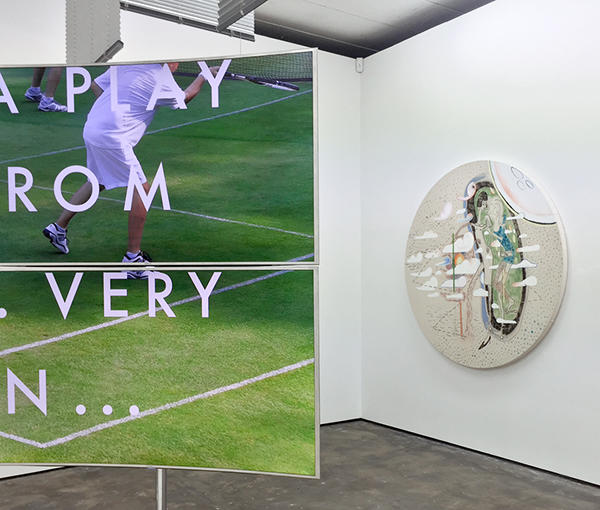 In Meisenberg’s exhibition „Um, nice guy, good hospitality, but.. y'know.. I-I- I don‘t think he knows how to turn on a computer. (brief pause) So... but th-the good thing is he's filling the void.. uh, with coverage in xxxxxxxxxx at the moment so y'know they're-they're not drowning.“ the thematic connection of reality and simulation is key to Meisenberg’s work. In this context, the motif of the tennis match has a haunting precursor in film history. Michelangelo Antonioni’s Blow Up ends with a fictional match played by mimes. In the moment when we as spectators see the eyes of the protagonist move and hear the sound of an invisible ball, the simulated tennis match suddenly becomes real. Although we ourselves cannot see it, mirroring becomes the tool for seeing the simulation of reality.