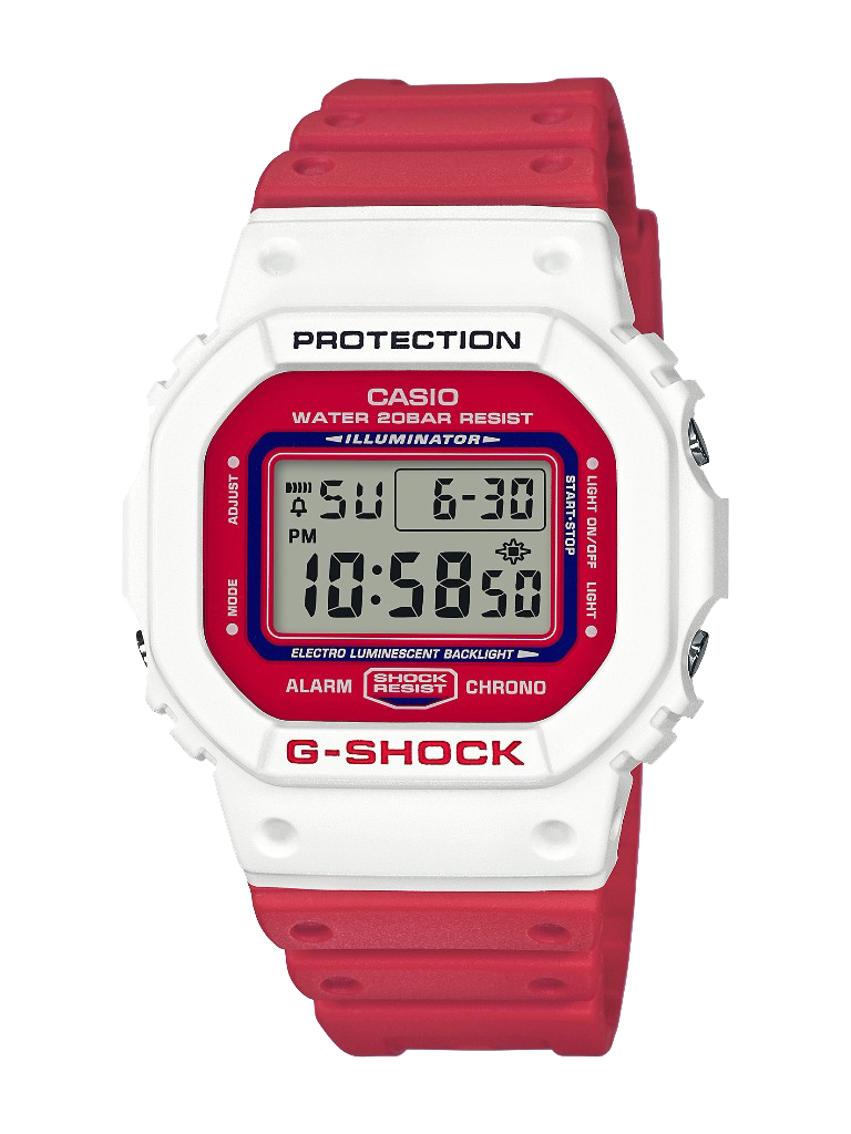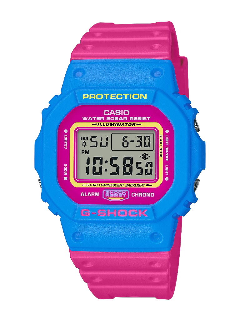 As we are at the helm of the G-Shock 35th Anniversary in 2018, Casio celebrates the 1980s with the release of four new G-Shock DW-5600 watches. The DW-5600TB Throwback Series is based on the classic square case which resembles the original G-Shock DW-5000. Each watch features a bold two-tone design with color combinations inspired by ’80s street fashion. The models include the black and yellow DW-5600TB-1, red and whiteDW-5600TB-4A, pink and light blue DW-5600TB-4B, and purple and green DW-5600TB-6.
