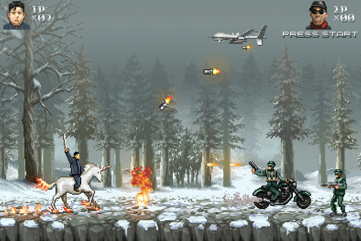Kim Jong Un? Check! Unicorns? Check! Dennis Rodman? Check! American pig-dogs? Double-check! Moneyhorse LLC is about to release a retro style run & gun game, which might be the most epic and overall greatest video game of all time.
