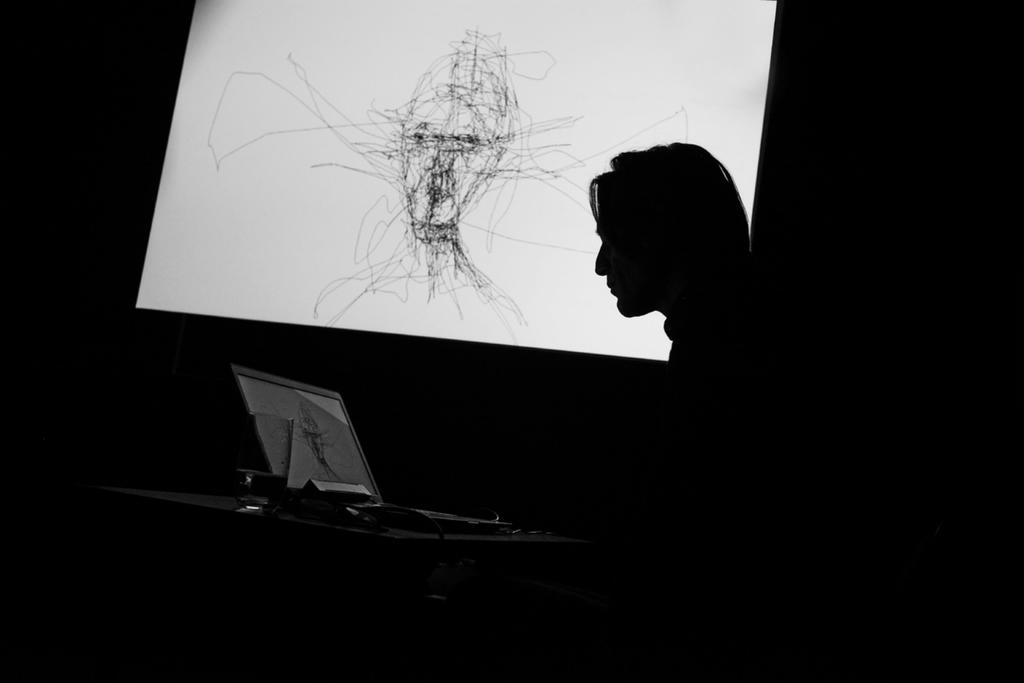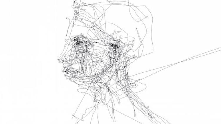 Fink worked with a programmer to develop software for an eye-tracker that would allow him to draw simply by looking at the screen. The reflection of this movement is recorded with a camera but allows him only to draw with a continuous line, erasing is not an option. Thus, it can take from five minutes to an hour to complete a portrait, depending on his level of concentration. Graham Fink has a meditation background which allows him to clear his mind as much as possible, yet the exercise is not easy, resulting in haunting yet beautifully imperfect portraits of faces.
