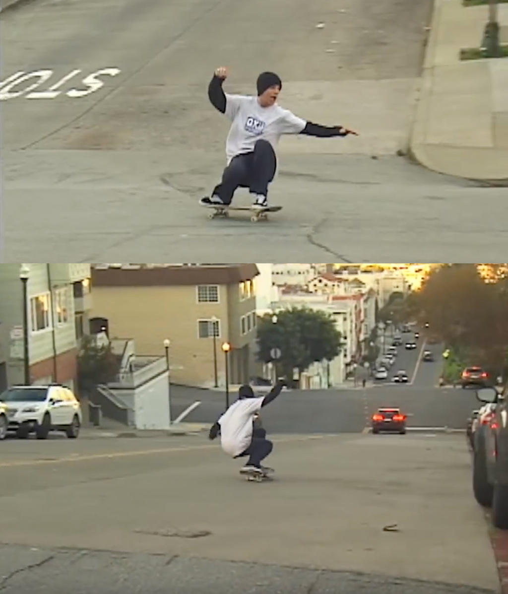 Landing a trick means usually you’re hyped up in victory, but if you’re rolling in San Francisco putting four wheels down is just one part of the game. Next up is further riding and bombing these scary hills. Big Ups to GX1000 for documenting the action.