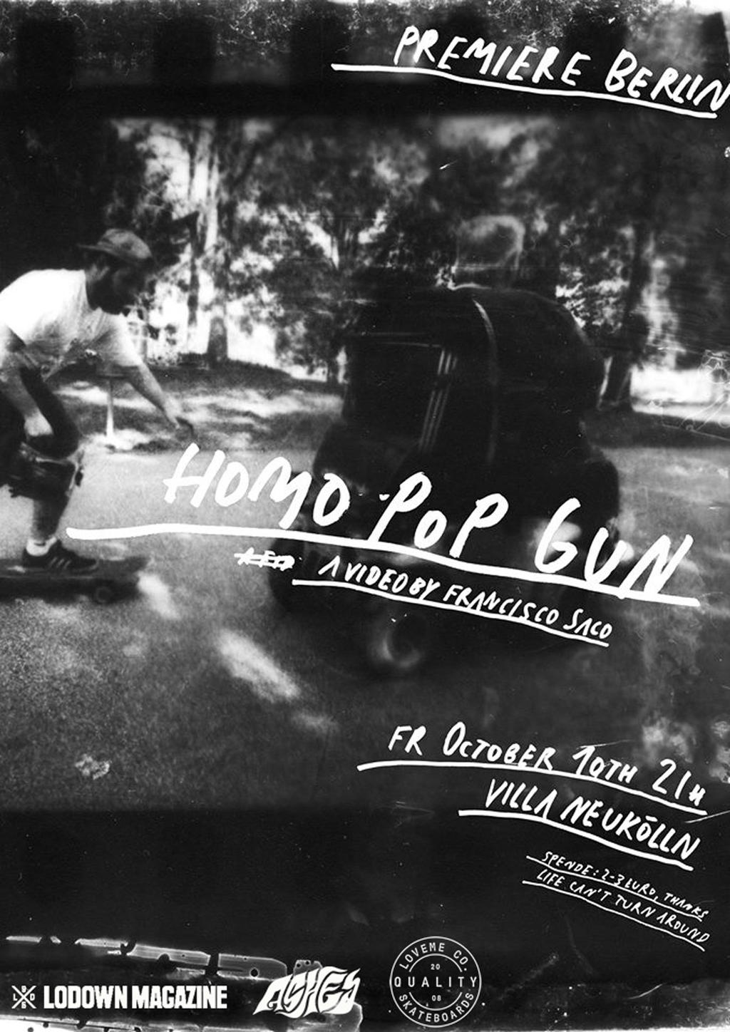 The world premiere of the Homo Pop Gun video will take place on Friday, October 10. The screening will be held in the back room of Villa Neukölln, located at Hermannstrasse 233, corner of Biebricherstrasse (U8 Boddinstr).
