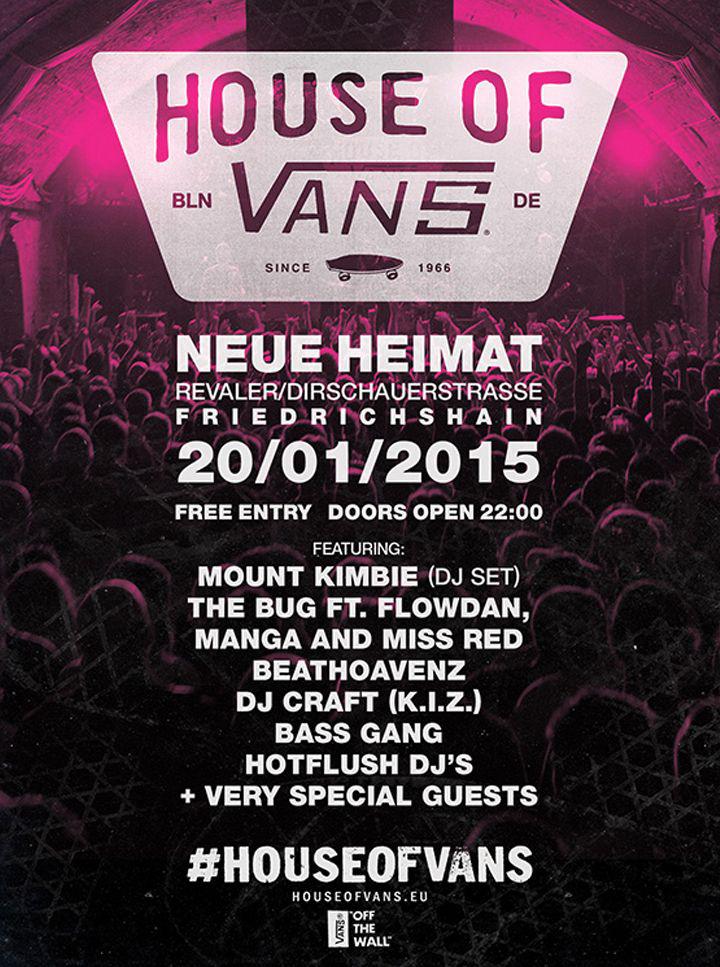 “Occupying a new venue for 2015, House of Vans takes up residence in Berlin's Neue Heimat, Friedrichshain, and for one night only, will present some of the creative capitals finest DJs, bringing together Hip-Hop and Electro acts. Local talent in the form of Beathoavenz, K.I.Z.'s DJ Craft and rising stars Bass Gang, plus more, will be complemented by London based Electro duo Mount Kimbie and The Bug as well as some very special guests! Keep an eye on HouseOfVans.eu for updates and announcements.