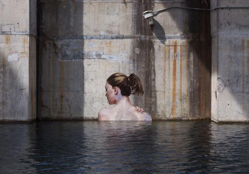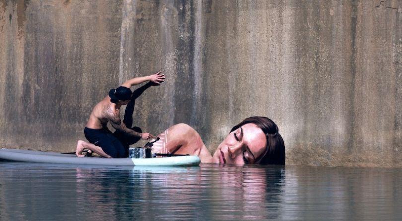 The imagery of women graciously emerging from water has been used in the art, movies and photography for decades. Before this very unorthodox series of murals he had already made a name for himself with portraits of women painted on canvas and even on old surfboards. You can follow his new artworks on his instagram.