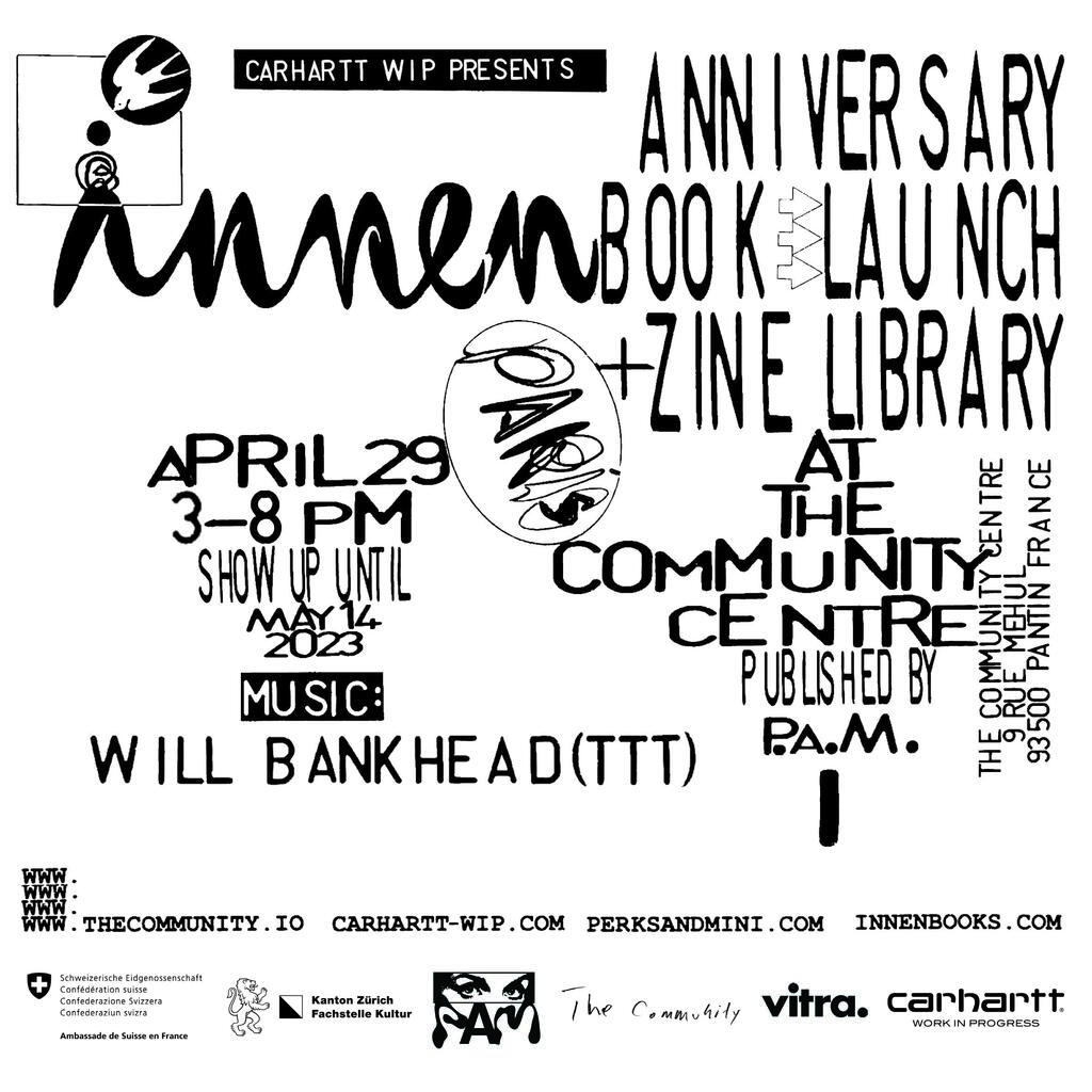 Alongside the anniversary book, The Community Centre will host the innen Zine Library including a vast selection of publications available for purchase. During the opening, The Trilogy Tape’s founder Will Bankhead will play an experimental music set in the gallery.