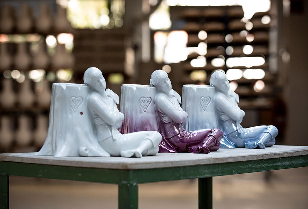 When FAILE artists Patrick Miller and Patrick McNeil met with KPM Berlin for the first time in 2017, it was still completely open what a joint project could look like, but quickly it became clear that the joint object was to be a porcelain version of an iconic character for the New Yorkers: The dreamy girl, created for the first time in porcelain, leaning against a tree trunk, belongs to a motif known in the 20-year success story of FAILES and the international art scene.