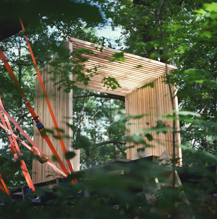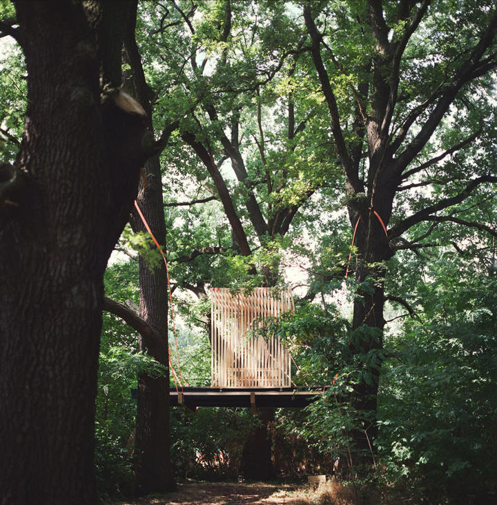“LIFTCABIN works like a prefabricated home. With 16 parts it is built within two hours. The prototype accommodates eight people. You can easily disassemble, pack, and bring it to a new location. After all it weighs just 350kg. It is secured and lifted using tension belts, which have such power that the house could be prospectively planned also much larger. Another advantage of LIFTCABIN is that the tree remains unharmed. When the tree grows and LIFTCABIN hangs crooked after a while, you just retighten the belt. This flexibility cannot be provided by an ordinary tree house. Moreover there is a lot of potential in the multi-functionality. In addition to the obvious possibility of using it as a classic tree house, it is conceivable to use the object for exhibition booths, theater performances, as a bed at festivals or as accommodation for the homeless.“