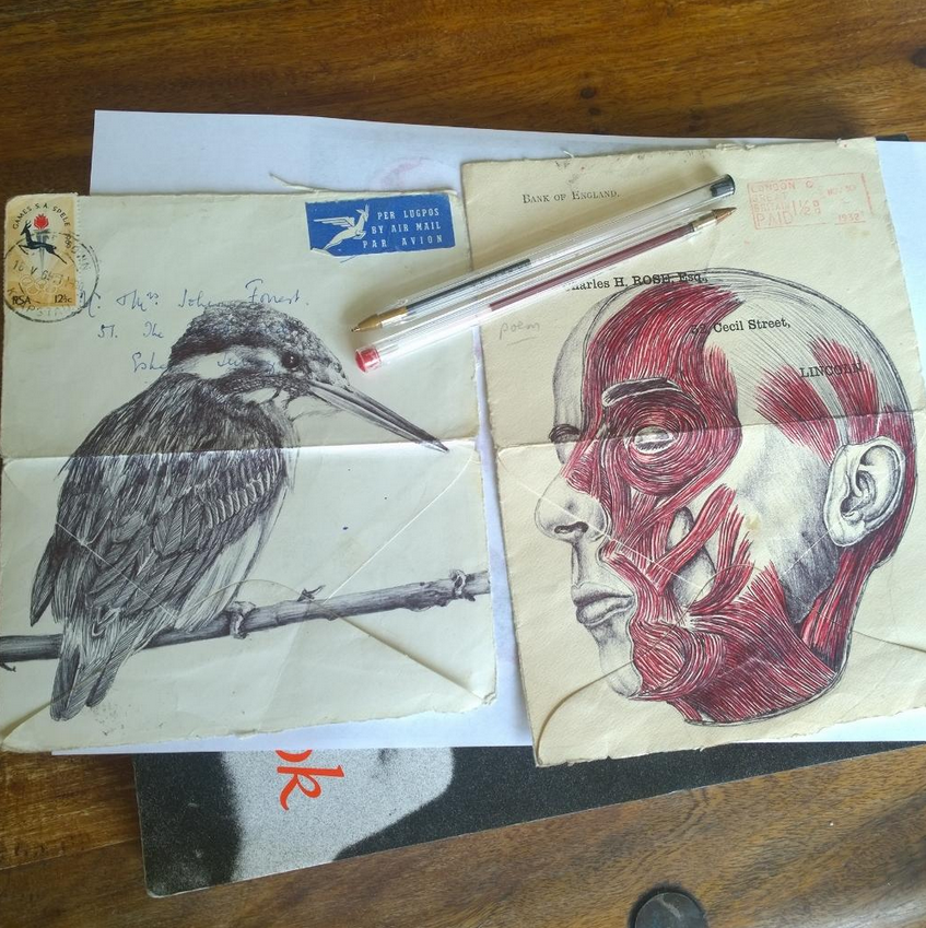 Powell's signature intricate bird drawings on found envelopes and postcards have generated hundreds of loyal admirers and collectors.