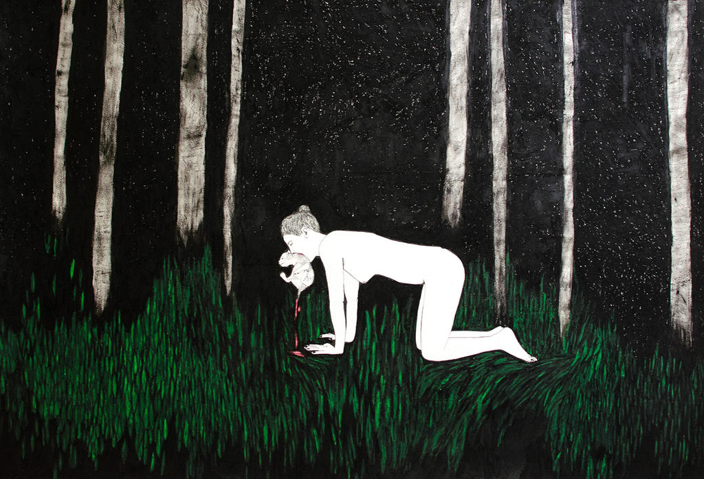 In this piece the woman is holding a small injured animal in her mouth but it's not clear why, making you debate if she is trying to save it from danger or if she is the aggressor. I try to take the soft supple feminine body and present it in a dark context, giving the viewer an uncomfortable desire to ask questions about cultural conscience, social conventions and the reality we live in. I tend to use a labour of intensive and precise technique that creates a space that is rich on small details. Alluring the viewer I try to catch their attention and have them linger in front of the piece, provoking them to examine it closely. And sometimes, it seems very delicate when viewed from a distance but then when you get closer they are exposed to more of a volatile moment. I like to go back to our instincts – the ones that force us and make us survive. It’s about the beauty in pain and pleasure.