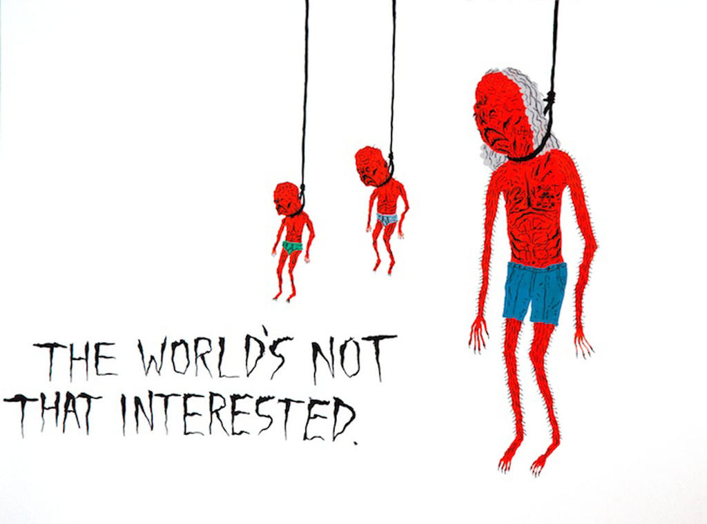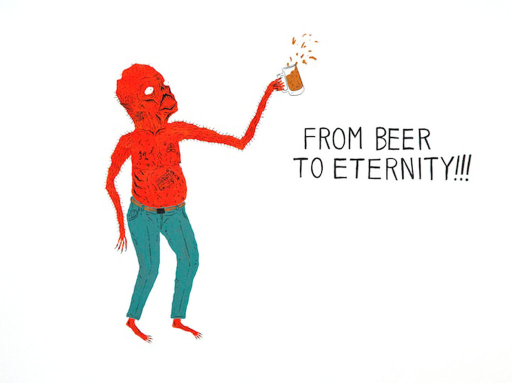 If you haven’t seen or heard anything about the most vulgar/sassy/sophomoric/ L.A artist Neckface in the last year it is not because he took a break from the scene. In fact, he was working on his upcoming solo exhibition that will take place in his hometown at the New Image Art Gallery. Inspired by the tenaciously seedy bar culture of L.A, “Drinking On The Job” is stimulated by and fully consumed with the world of alcoholic hedonism through the eyes and mouth of Neckface himself.